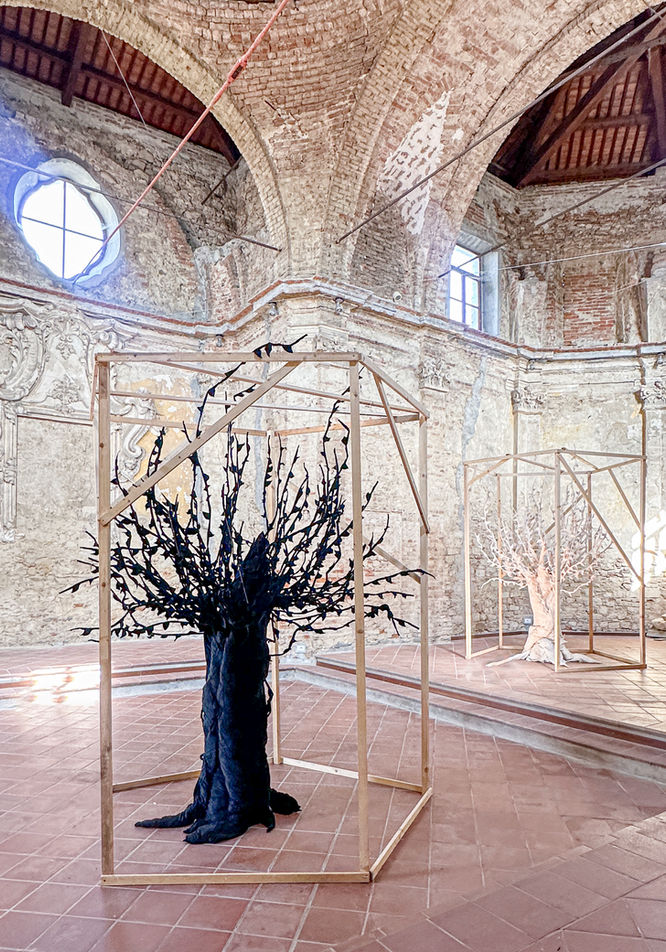 La coppia di Ulivi, uno in pregiato broccato di cotone bianco e l’altro in delicato velluto nero, quasi umanizzati nella loro morbida consistenza e nella posizione estranea al contesto naturale, tratta due temi molto significativi e ricorrenti nella poetica di Elizabeth Aro: da un lato l’albero come simbolo e rappresentazione della Natura e dei suoi cicli vitali, dall’altro la transitorietà dell’arte soggetta, come l’albero, a continui cambiamenti e trasformazioni. L’albero include in sé un ciclo vitale che connette il mondo degli Inferi, in cui affonda le radici, al mondo Celeste, dove si espandono i rami: concretezza unita a fantasia, bisogni fondamentali connessi a necessità spirituali. La coppia bianco/nero richiama gli opposti e la capacità di acquisire consapevolezza di sé grazie alla presenza dell’altro, visto come indispensabile alter ego per raggiungere una piena essenza, una consapevolezza del proprio io come unione di contraddizioni. L’ulivo, pianta sacra ad Atena, presente in numerosi testi sacri, evoca saggezza e armonia. Questi alberi, si fronteggiano, si cercano: si tratta di un confronto tra opposti, in cui la crescita dell’uno avviene grazie alla presenza dell’altro.