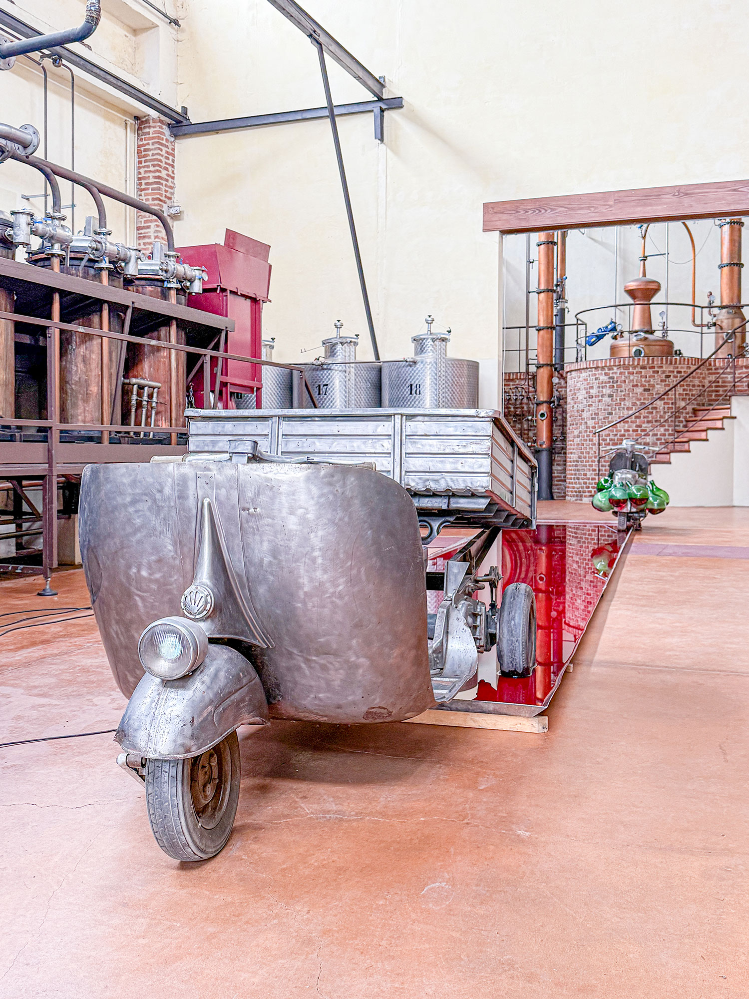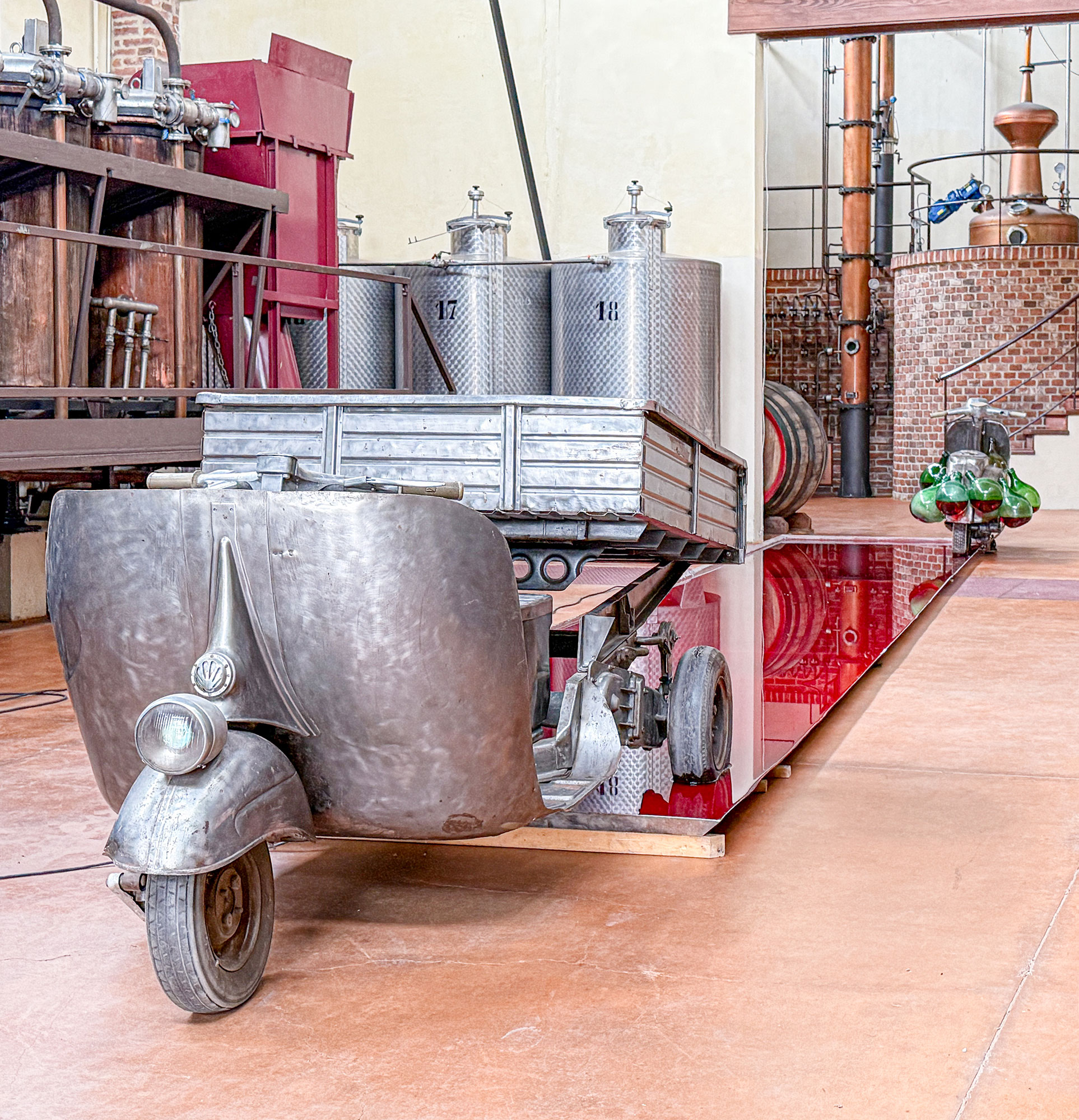 I due mezzi di locomozione, testimoni di un tempo che fu e di un mondo ormai lontano situato a cavallo tra dimensione industriale e rurale, richiamano con la loro nuda lamiera il contesto ospitante.