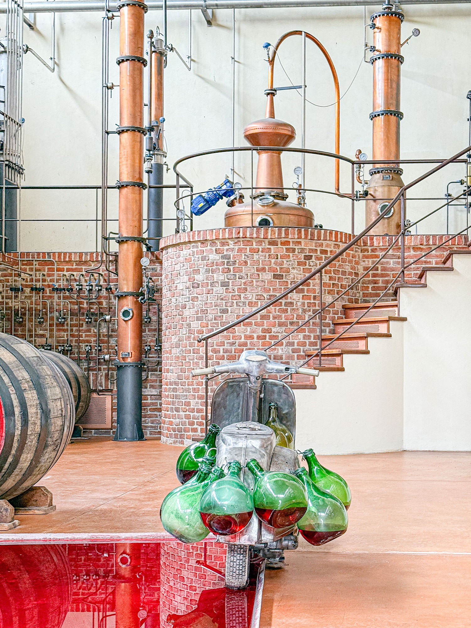 Nella sala degli alambicchi della Distilleria Bosso è ambientata l’imponente installazione di Enrico Iuliano realizzata in occasione di Germinale. Comingoing è composta da due lavori distinti: Ape del 2006 e Composizione per vetri su Vespa del 2005, collegati da una vasca di lamiera zincata lunga nove metri.