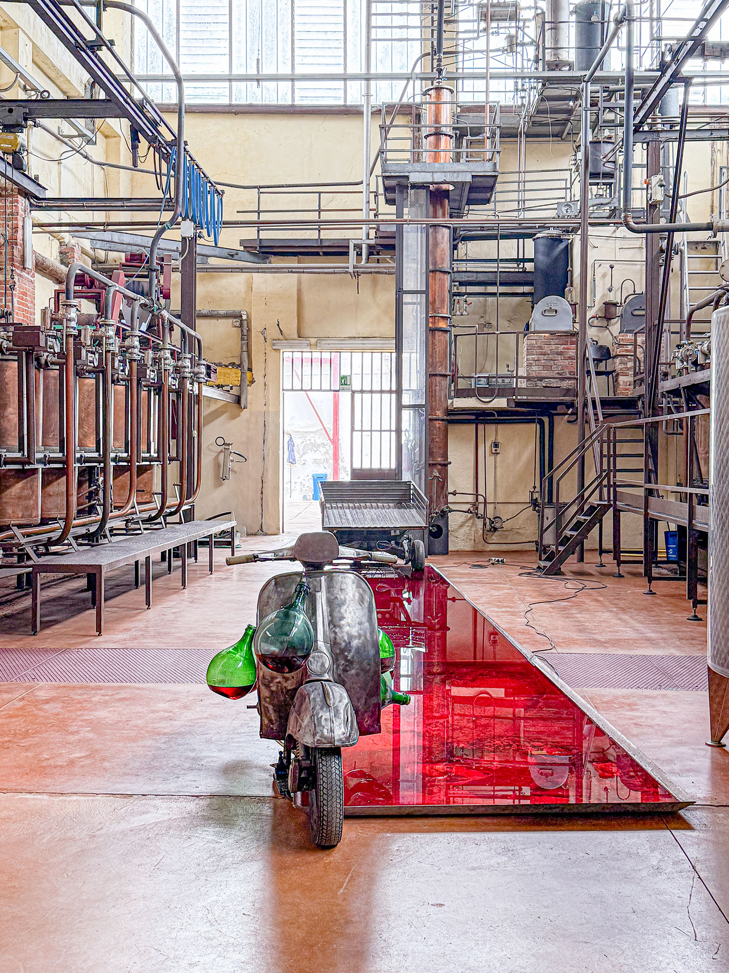 La vasca è colma di un liquido rosso che scorre a rivoli dal motocarro, lungo la lamiera del cassone, e da piccoli fiaschi in vetro, collocati a bordo della Vespa.