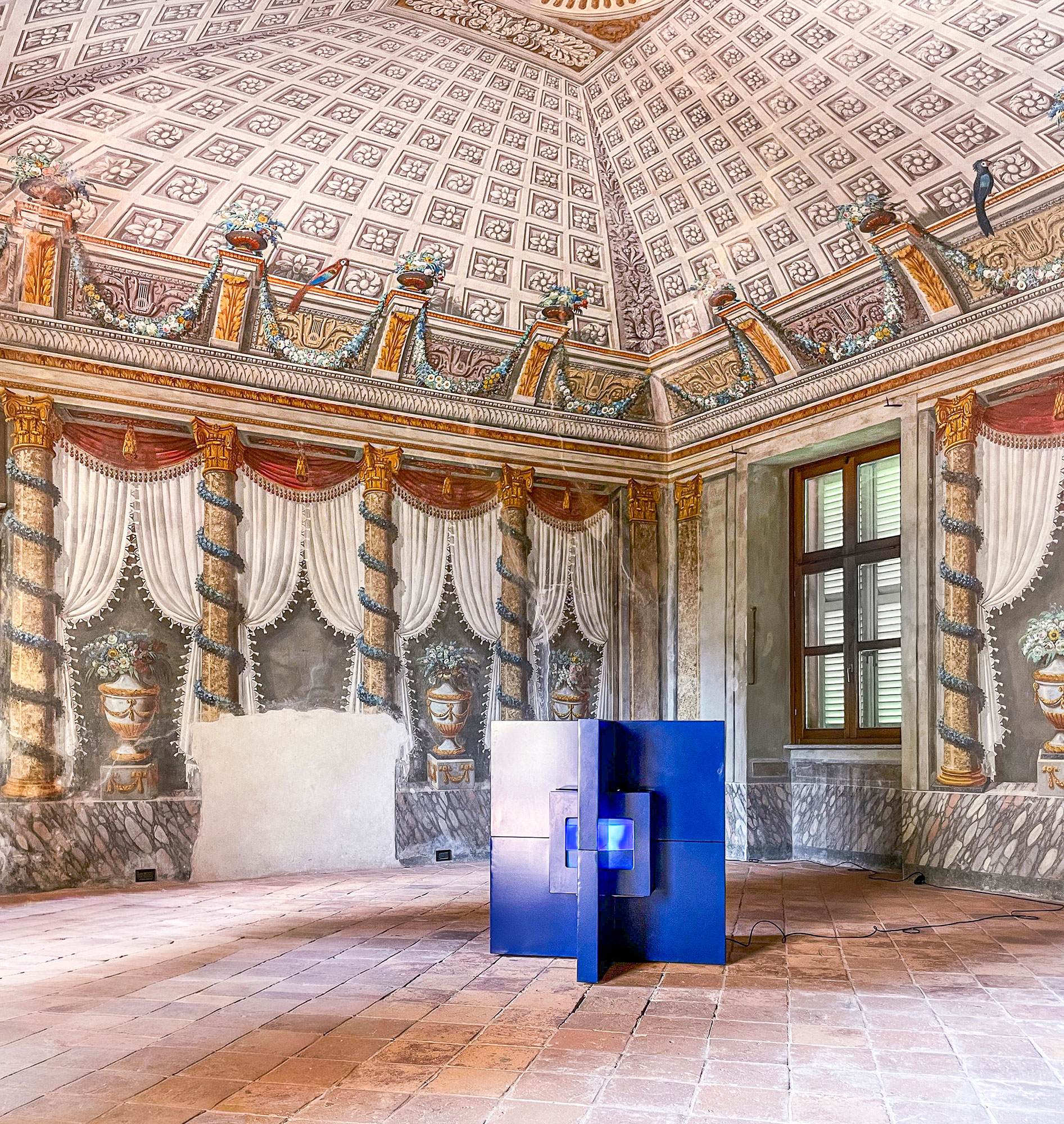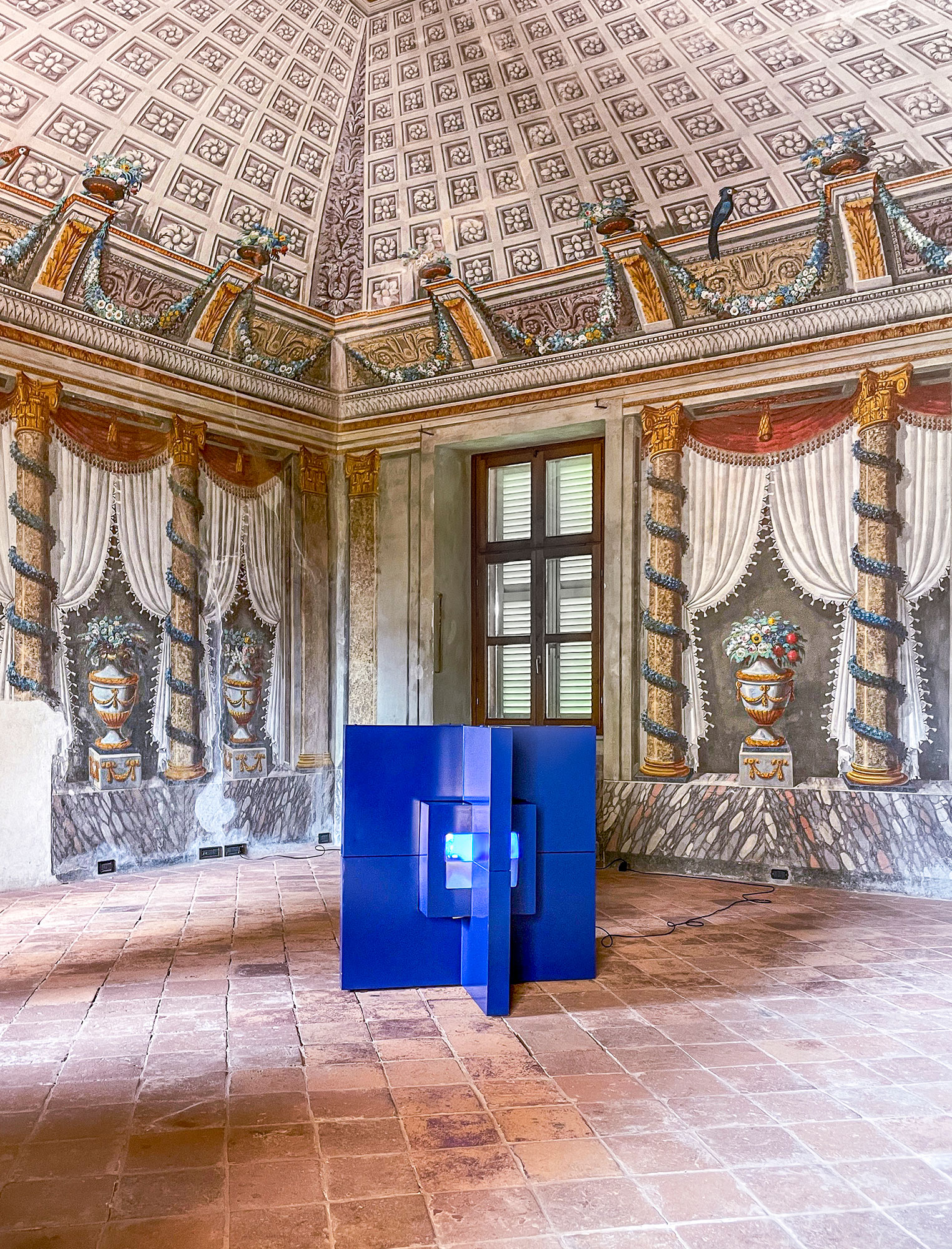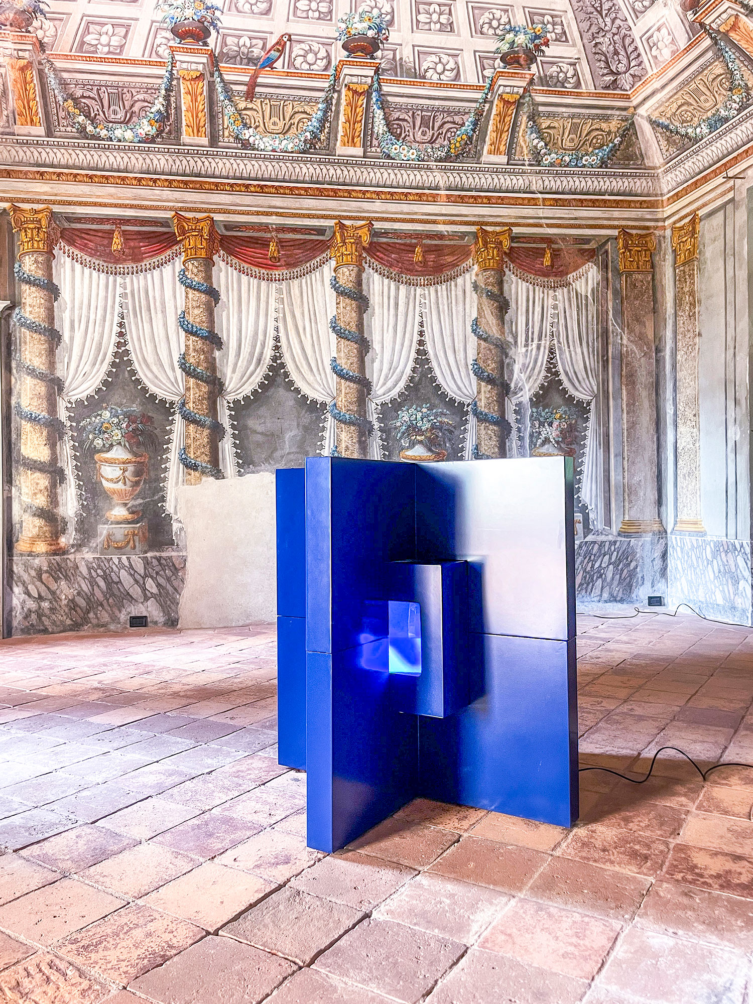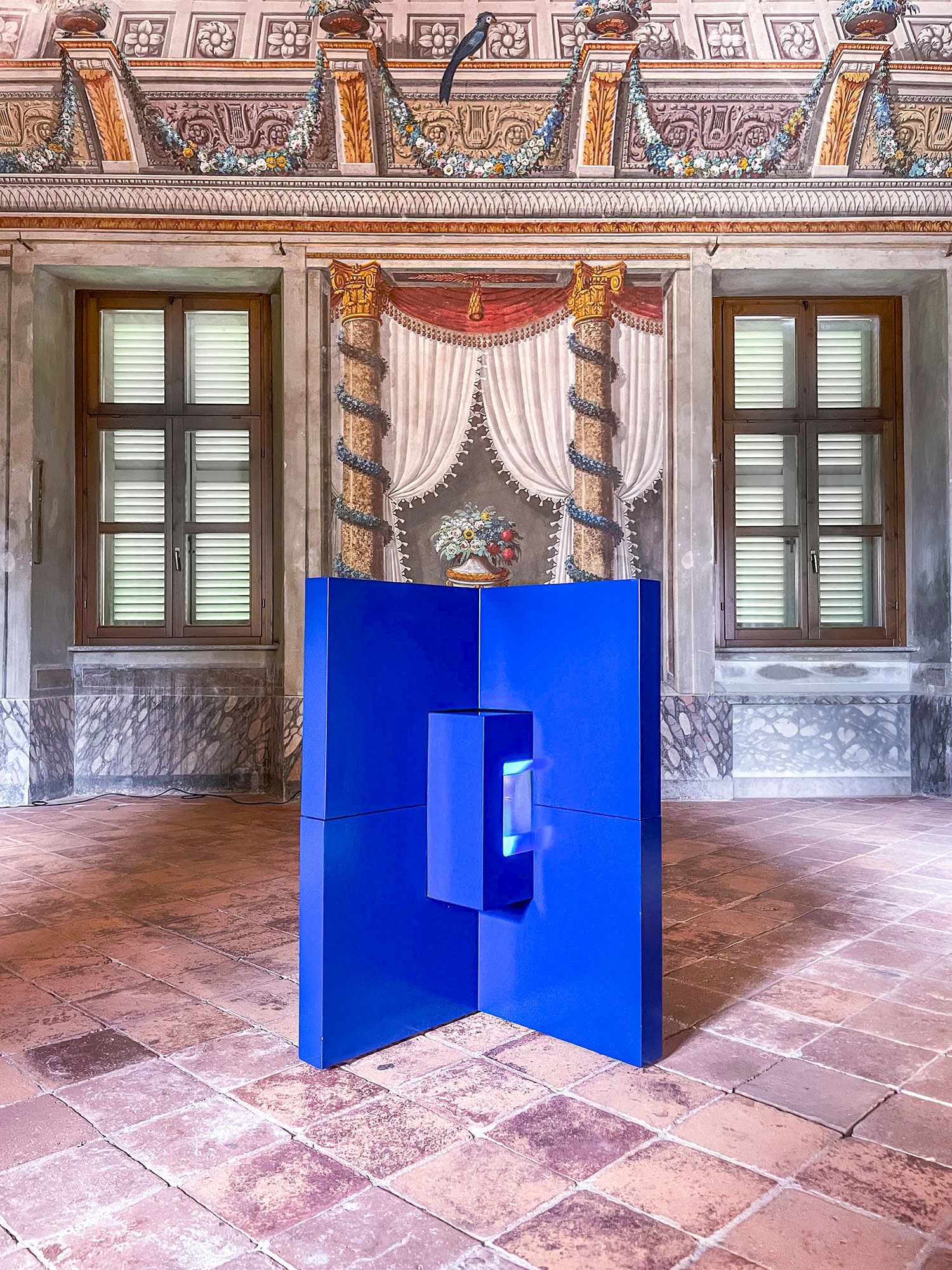 Il suo significato si fonda su un delicato equilibrio tra la fisicità e il peso materiale della scultura e l’immaterialità dell’immagine in movimento che essa racchiude; tra la pulizia delle forme e la sobrietà del filmato. Questa tensione rimanda, in realtà, a una dimensione esistenziale, evocando la ricerca di equilibrio interiore che ogni individuo tenta di costruire all’interno delle rigide convenzioni della realtà formale. In tale prospettiva, l’ombra che attraversa la scultura, assume un valore simbolico, rappresentando idealmente, quella parte intima e spesso inespressa che abita ciascuno di noi. Camerani, nel progettare le sue esposizioni, trae costantemente ispirazione dal luogo in cui opera e dalla sua storia. Il blu metallico dell’opera Io-Io richiama finemente le tonalità blu presenti nei dettagli decorativi degli affreschi che ornano la volta della sala. Inoltre, la forma squadrata dell’opera contribuisce, per contrasto, a esaltare il fascino intrinseco degli ambienti storici di Villa La Mercantile. Anche in questo caso, ritorna il tema dell’equilibrio, suggerito dall’elemento della trave che attraversa le due sale del palazzo e che diventa motivo di connessione tra le opere esposte.